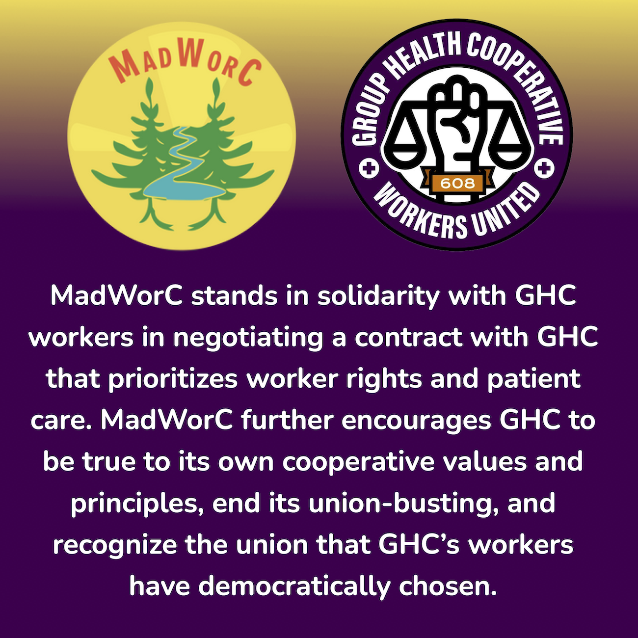 MadWorC stands in solidarity with GHC workers in negotiating a contract with GHC that prioritizes worker rights and patient care. MadWorC further encourages GHC to be true to its own cooperative values and principles, end its union-busting, and recognize the union that GHC’s workers have democratically chosen.